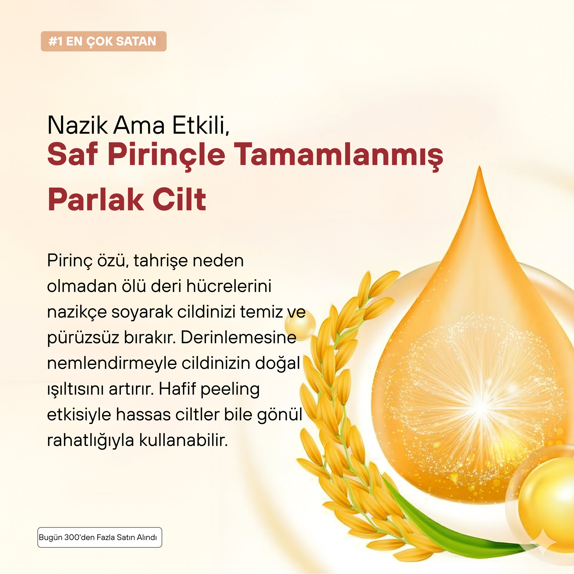 Cildinize zarar veren sert peelinglerin veya tahrişe neden olan kimyasal peelinglerin aksine, pirinç özlü formülümüz kirleri nazikçe çözerken sonuçları gerçek zamanlı olarak görmenizi sağlar. Kızarıklık, soyulma veya iyileşme süreci olmadan anında işe yaradığını görsel olarak kanıtlayan tek peeling ürünüdür.